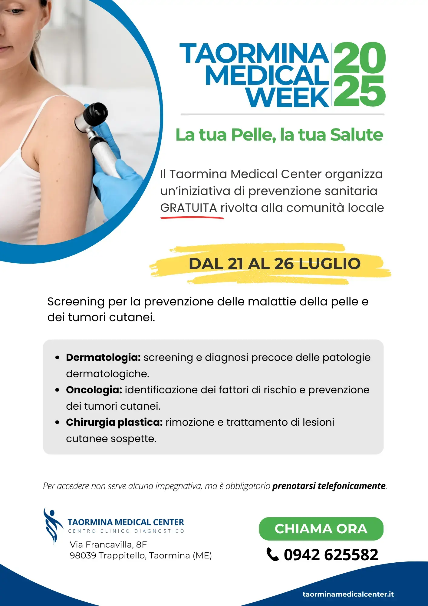 Dal 21 al 26 luglio 2025 il Taormina Medical Center apre le porte per la terza tappa della Taormina Medical Week 2025. In questa settimana dedicata alla cura della pelle, tre specialisti offriranno consulenze gratuite su appuntamento: