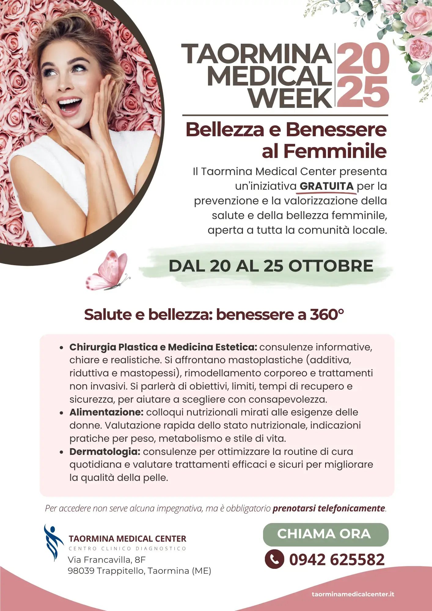 Dal 20 al 25 ottobre il Taormina Medical Center dedica una settimana alle donne. “Bellezza e Benessere al Femminile” unisce prevenzione e valorizzazione: un percorso di consulenze pensato per salute, aspetto e benessere quotidiano. Le consulenze sono gratuite e si svolgono su appuntamento.