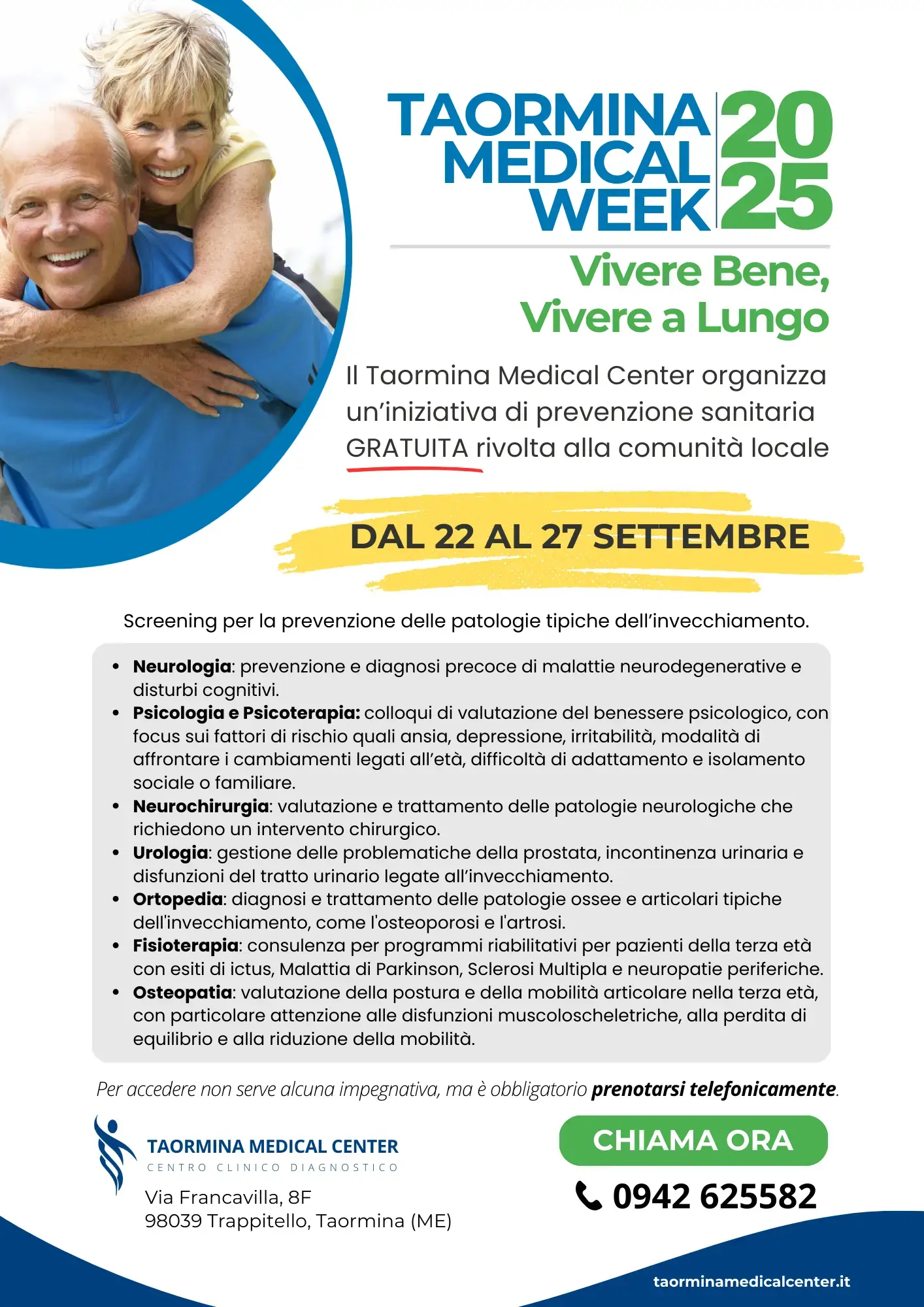 Per chiunque voglia informazioni immediate: Taormina Medical Center, Via Francavilla 8F, Trappitello (Taormina). Prenotazioni al +39 0942 625582.